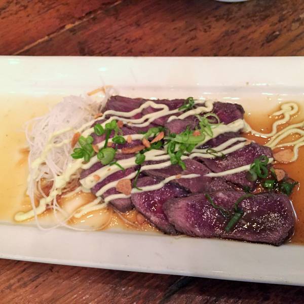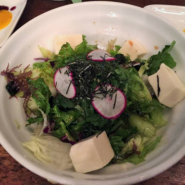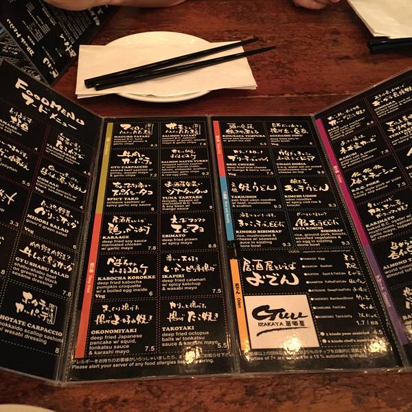 【名称】:Guu居酒屋 Guu Izakaya 【地址】:多伦多 398 Church St, Toronto, ON M5B 2A2, Canada 【电话】:416-977-0999 【环境】:一进到餐厅的时候吓了一跳,所有服务员都非常大声地用日语和我们打招呼,有一种全场焦点的感觉。虽然听不懂,但还是觉得很有趣。在用餐过程中,每当有客人进来或者离去时,全场服务员都会对他们致以大声的问候,中间还夹杂着锣鼓声。声音之响亮,震耳欲聋。这家餐厅内环境是模仿日本居酒屋的样子,凳子是长条形的木板凳,非常窄,桌与桌间距也很小,但这丝毫没有影响到服务生的热情。 【食物点评】:1)Gomaae日式菠菜小食,好吃2)Seaweed Tofu Salad海带豆腐沙拉,中规中矩,作为开胃菜我挺喜欢的,大多数国人可能会吃不惯。3)GYU Carpaccio 生牛肉sashimi,非常嫩,口感很好。4)油炸起司-Brie Cheese,有点类似北美crab rangoon的高级版,非常好吃,但是卡路里估计要爆棚。5) Karubi 牛仔骨,嫩,香,不错。6)油炸鸡,我朋友挺喜欢的,说实话到这里我已经快吃不动了。7)石锅拌饭。非常棒。我很惊讶,日本餐馆的石锅拌饭居然做得这么好吃,都快超过韩国店了,推荐。8)抹茶冰淇淋,不错。 【建议】:1)平时这家餐馆非常火爆,我们去的时候排队等了约四十五分钟。后面还有络绎不绝而来的客人,建议提前预约,可以使用这个网站预约(http://www.yelp.com/biz/guu-izakaya-toronto)2)如果是第一次去,建议点趴体套餐party menu,一共有两个可以选,一种是八道菜每人25,另一种是十道菜每人35,我点的是第一种,虽然每份都不多,但是全部吃完已经把我塞得饱饱的。3)尽量多带一些朋友一起去,趴体套餐至少要4个人才能点。