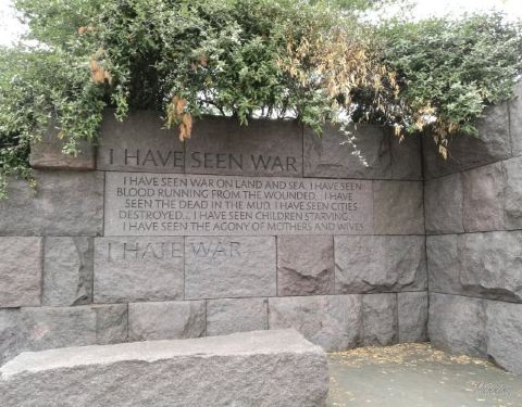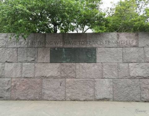 罗斯福纪念园位于潮汐湖的西岸,介于杰斐逊纪念堂与林肯纪念堂之间,是为纪念美国第32任总统罗斯福而建。此园不同于一般的纪念堂,错落有致的石墙成为主体,讲述罗斯福总统任职期间美国的重大历史事件。 纪念园石墙 石墙分为四个部分,分别代表着罗斯福总统执政的四个时期,他也是美国历史上唯一一位任职四届的总统,对于美国意义非凡。石墙上还刻着罗斯福总统说过的一些经典话语:“The only thing we have to fear is fear itself”,意为“我们唯一要恐惧的就是恐惧本身”。另外以石墙为背景还设有很多罗斯福总统不同时期的雕像,瀑布和图腾穿插其中,生动而深刻,令人流连忘返,感慨颇深。