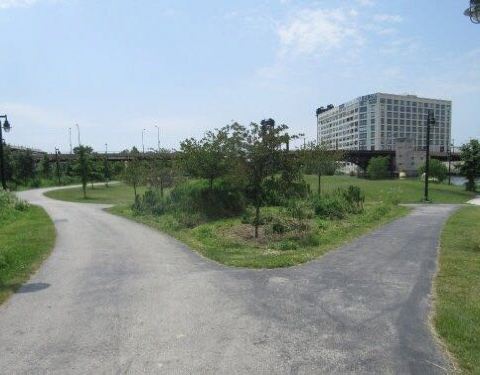 ...区里,其沿着芝加哥河岸修建,其实这是个很小的公园,类似于大家吃好晚饭去楼下小区公园散散步的那种