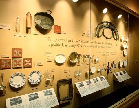 有打捞上来的衣物,珠宝,餐具,镜子,还有一大部分船体。每张船票后面都有那位乘客的年龄以及旅行路线