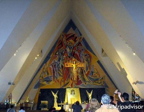 外观如同滑雪小屋的天主教堂,装饰有彩色玻璃壁画和马赛克。