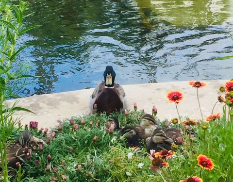 ...,不过景色很不错,池塘里有锦鲤,水面飘着莲花,特别是鸭妈妈带着小鸭子们在池塘边觅食的画面很温馨
