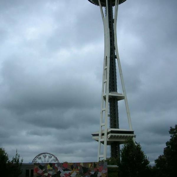 太空针塔顶层观景台的造型如同飞碟,是西雅图的地标性建筑之一。它是为了1962年西雅图世博会而建的.