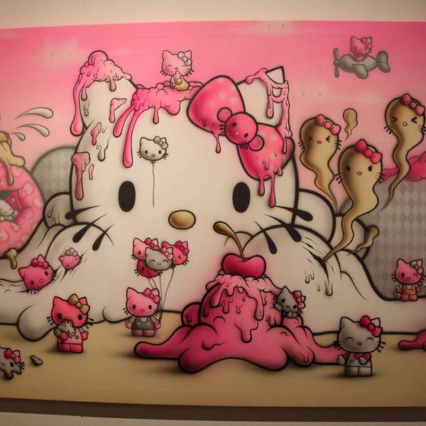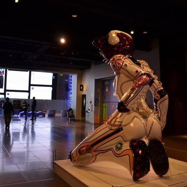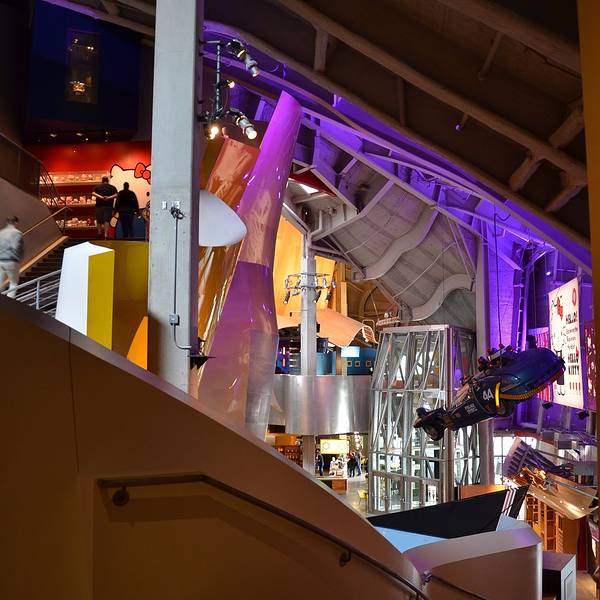 全名既是Experience Music Project。走到馆前大吃一惊,这光滑铝合金、不锈钢板,这飘逸洒脱的流线外形,这艳丽夺目的颜色,这诡异扭曲的建筑结构,而且单轨列车居然还从建筑中直穿而过···难道···这也是反叛鬼才Frank Gehry的大作!?再多看几眼很快就确定错不了啦,这位设计了洛杉矶迪士尼音乐厅、麻省理工State Center的大师真的是才华满溢、十分多产、大作遍布米帝啊。(外观在阴天下也这么炫酷,除了Gehry也是没sei了)(内部,从Nirvana展馆出来下一楼的途中,眼花+缭乱的建筑天花板)这座体现了Rock’n’Roll精神的神庙最然外表炫酷拽炸天,里面还比较自然柔和,不过复杂外形下内部结构自然也不简单,所有展厅蜿蜒穿插。进门先是个舞台,全球最大室内LED大屏幕在播放各种MV以及在这里办过的演唱会。向左就看到一个···什么···动作诡异的···机甲Hello Kitty···就是粉系高达脑袋掉了找不到然后···原谅偶的审美理解不了。(无法直视的粉喵酱)