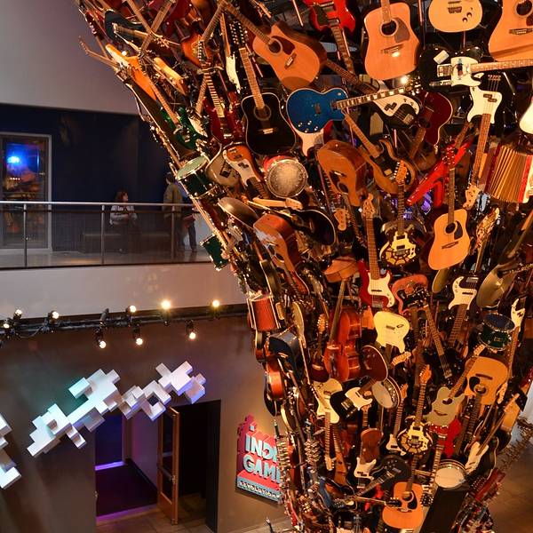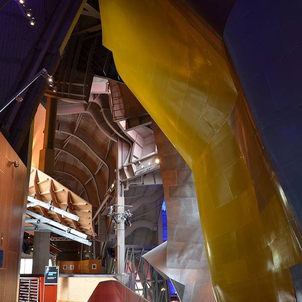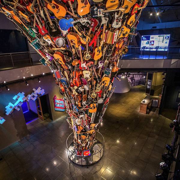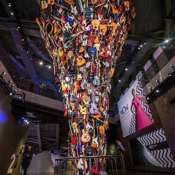 流行文化博物馆是美国有名的博物馆。其明亮的色彩和由3000枚不锈钢片铝片组成的外表展现了音乐的力度与流动之美,但其不拘一格的表现手法却并不被看好,位列福布斯榜世界非常丑的建筑第三名。室内展区很大一部分作品是为向Jimi Hendrix等当地音乐偶像致敬,讲述着摇滚精神以及整个美国流行音乐的发展史,高科技的运用更可以亲身体验音乐的魅力。 1. 展区介绍 1楼有咖啡屋和唱片店。2楼展示美国流行音乐的诞生和历史,以及Jimi Hendrix的作品展。3楼体验中心是十分受欢迎的地方,在这里你可以试着去玩吉他、鼓、键盘、DJ转盘,还可以自己创作歌曲。另外一个展示的焦点是从30年代初开始的有关吉他的历史,其中包括较早的电吉他展示。 2. 乐器雕塑“if VI was XI” 一进入博物馆就能看见巨型的乐器雕塑“if VI was XI”,在看见它之前你可能根本无法想象,这无数乐器堆栈延伸至顶,迸发出来的是怎样的一种热血沸腾。