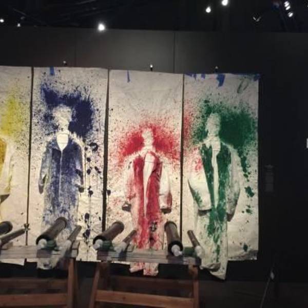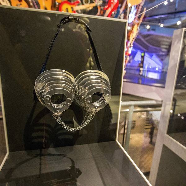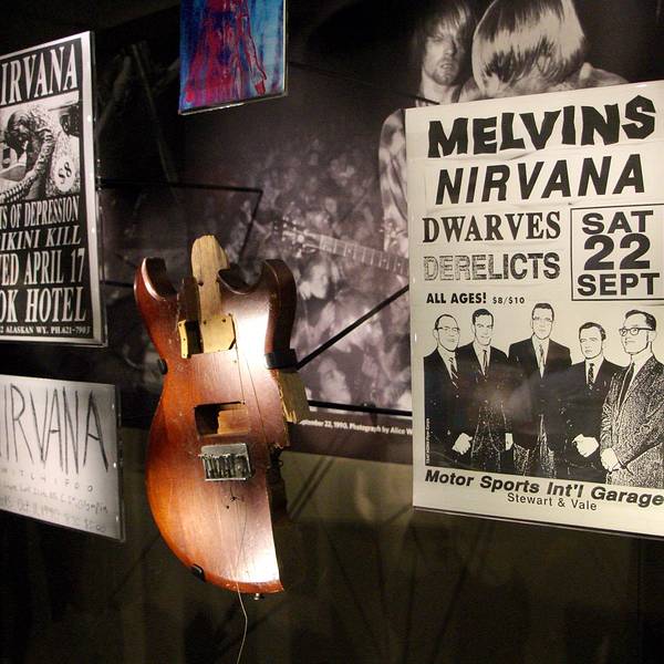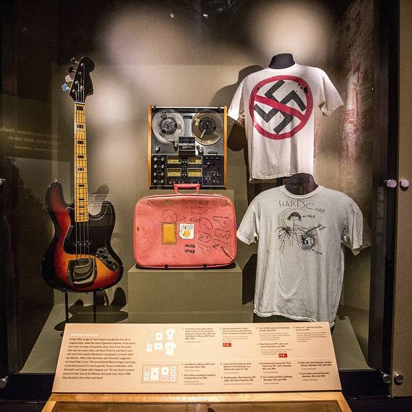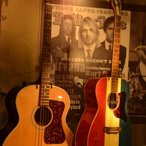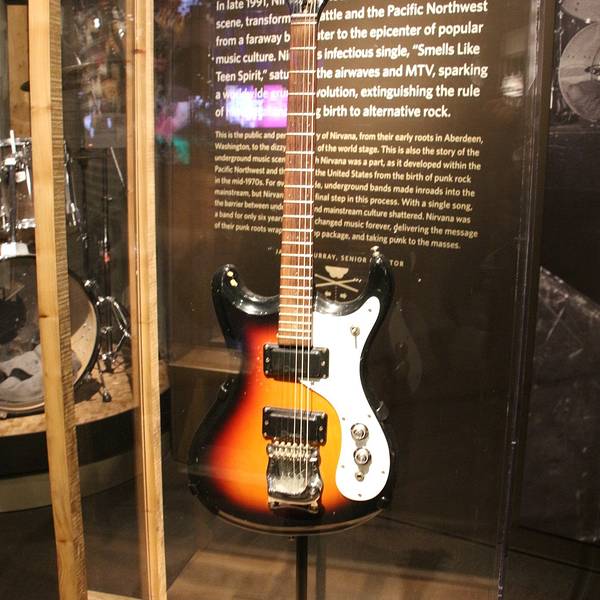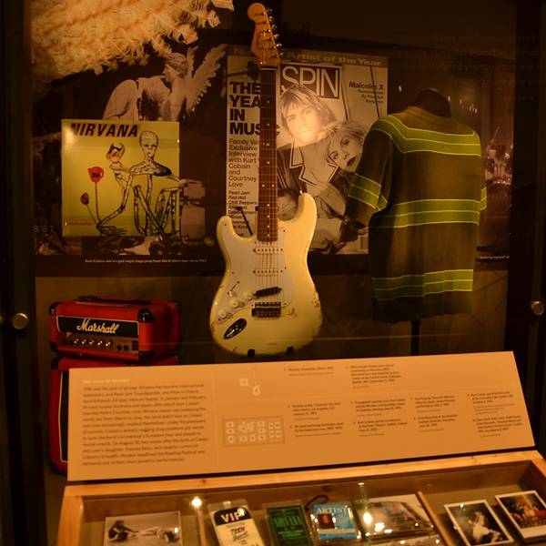展厅里根据时间线,展出了乐队绝美主唱Kurt Cobain和队友的生活照、服装、Kurt砸过的一水儿吉他(爱之深砸之切砸砸砸砸了一排吉他)、唱片demo、模型、封面设计等。仔细听听《In Bloom》、《Smell Like Teen Spirit》真的能感受到Kurt的才华和与众不同,体会到当时的这个“小众”如何因为体现了当初众多年轻人的生活状态而成为了“流行”。(入口三把吉他)(录 Smell Like Teen Spirit 的 MV 时穿过的衣服+砸过的吉他)(Kurt有才,还长得美,不爆红还有什么办法呢)