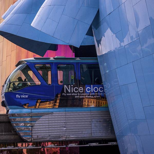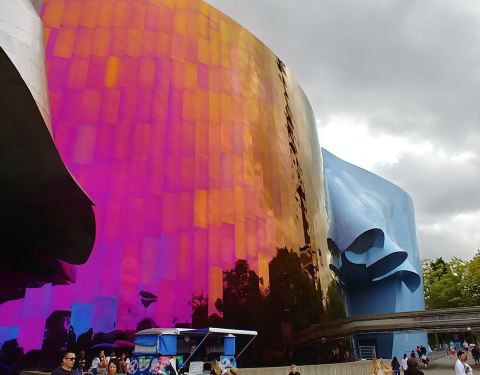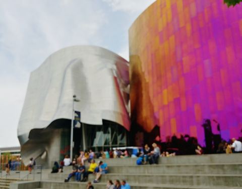 全名既是Experience Music Project。走到馆前大吃一惊,这光滑铝合金、不锈钢板,这飘逸洒脱的流线外形,这艳丽夺目的颜色,这诡异扭曲的建筑结构,而且单轨列车居然还从建筑中直穿而过...-【EMP 西雅图音乐体验馆