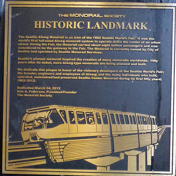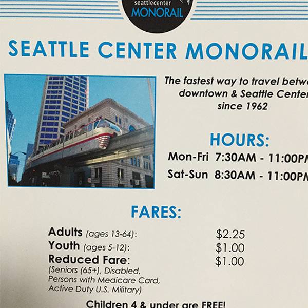 西雅图无人驾驶的单轨列车MONORAIL从空中贯通西雅图中心Seattle Center和西雅图市区中心Downtown。两地距离2公里多,步行半个多小时,单轨车行驶几分钟就到了,中间不停。单轨车次间隔时间很短,大约10分钟,乘客很多。单轨车穿过繁华大街,在高楼大厦间穿行,一览闹市区街道。1962年西雅图举办了世博会,场馆就在西雅图中心,单轨列车是为适应世博会交通特别修建的。单轨车一头是西雅图中心,当年的世博会场馆现在是博物馆,展览馆等,如音乐体验馆,最有名的世博会标记性建筑太空针塔( Space Needle)附近就是车站。单轨车的另一头是市中心的WESTLAKE CENTER,车站也是西雅图Downtown的交通枢纽之一,可以转乘地铁和很多路公交车。出站步行几分钟就是派克市场Pike Market和著名的第一家星巴克 First Starbucks Store。这两处是西雅图游必去之地。候车时看到落款是单轨车协会的一块纪念单轨车运营50周年的牌子,介绍说,当年世博会时期,单轨车承载了800万人次。一次在咖啡馆和当地老先生聊天,窗外能看到高高行驶的单轨车,我们问他,这么好的交通,为什么没有继续建呢?老先生说,几届议会都否定了再建单轨列车的提议,扩建单轨车的梦想已经结束,单轨列车是历史印记了。我们住的酒店离西雅图中心站很近,乘坐了好几次单轨列车,是一种体验,也节省了时间。 票价(单程)2.25美元,老年人65以上和5-12岁小孩优惠价1美元。购票只收现金。 运营时间:周一 到 周五 7:30am - 11:00pm, 周六,周日8:30am - 11:00pm