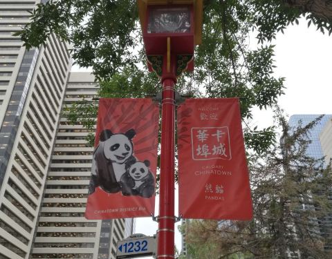卡尔加里城里的中国城,中国城里中国的新老移民聚集了不少,这里虽然是加拿大,但是普通话基本通用,在这里你是中国人不会英文,你一定也不用担心语言交流不畅吃不到想哭的东西。 在中国城附近还有很多印着熊猫的刀旗……看起来是有活动呀!
