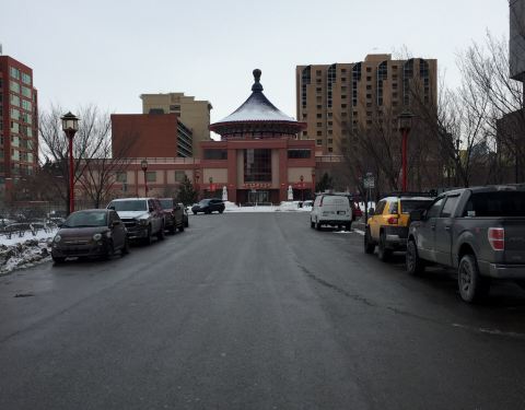 这里是卡尔加里的中国城,标志性建筑顶部是参考天坛的圆顶建筑,这里是卡尔加里华人的综合性文化交流活动中心,它的中式建筑和周围卡尔加里最集中的摩天大楼融为一体。