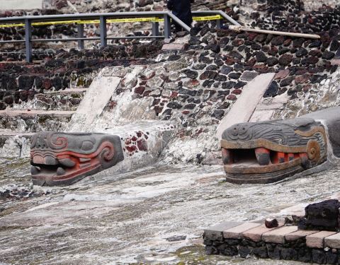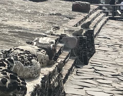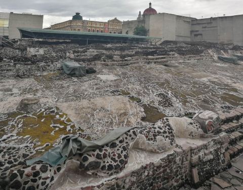 位于墨西哥城市中心的遗址,就在基柱广场的东北侧,它的南部是国家宫,西部是大教堂。整个遗址占地面积和大教堂相差不大,目前只剩下残垣断壁,据说造成大神庙被毁就是由于方面西班牙人入侵后要修建隔壁的教堂,大量神庙的砖石被用在了教堂的建筑上。此外在遗址旁建立了一个博物馆,大量神庙遗址中的文物就在这里展出,这个神庙应该是墨西哥城内最值得一游的景点,墨西哥城的世界遗产标志就在大神庙的广场上