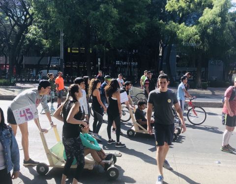 周日墨西哥城改革大道不通车,有跑步,轮滑,滑板,自行车,还有推着婴儿车跑的,连自制的木头板车都出来了
