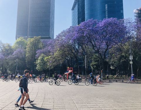 开元周游墨西哥一日游,周日墨西哥城改革大道不通车,有跑步,轮滑,滑板,自行车,还有推着婴儿车跑的,连自制的木头板车都出来了。