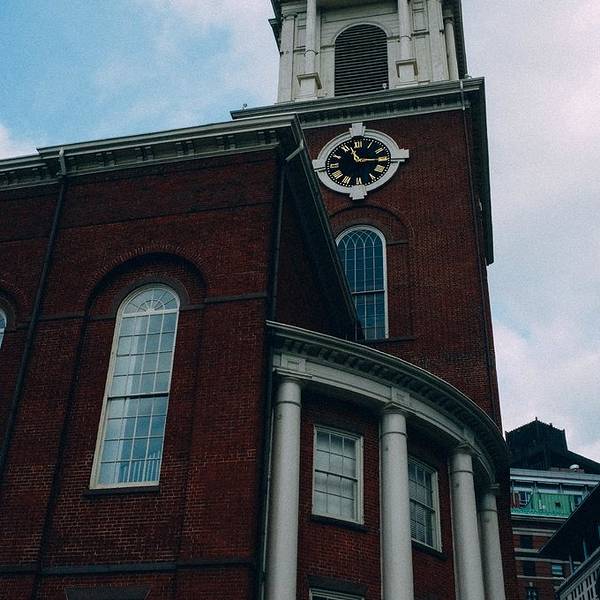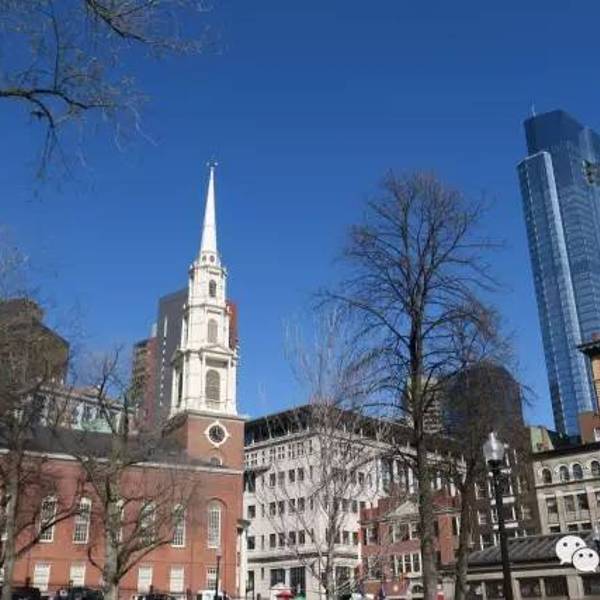 绕过这个街角,其实也是对着地铁站一上来就看见的尖顶建筑,就是公园街教堂(Park Street Church)了。它由26名当地人创立于1809年2月27日,大部分曾是老南聚会所的成员。5月1日教堂奠基,年底建成。1810年1月10日举行第一次礼拜。公园街教堂的尖顶高达217英尺(66米),至今在波士顿的几个街区都可以看见。教堂每天的开放时间很有限,图片里有时间,所以看了看表,就擦身而过了。