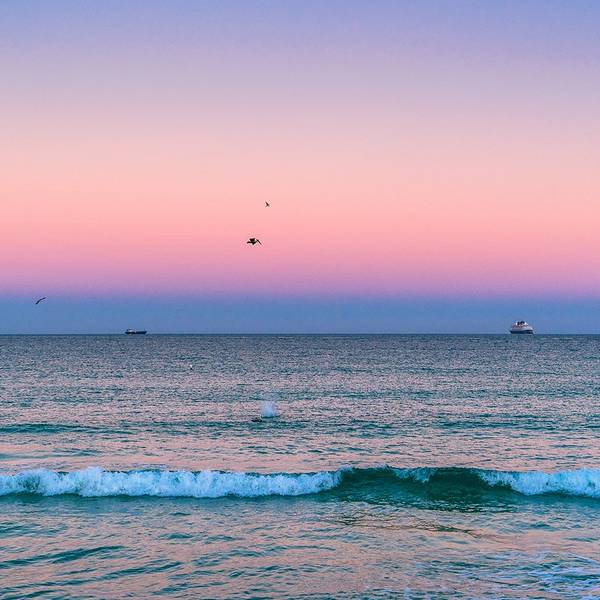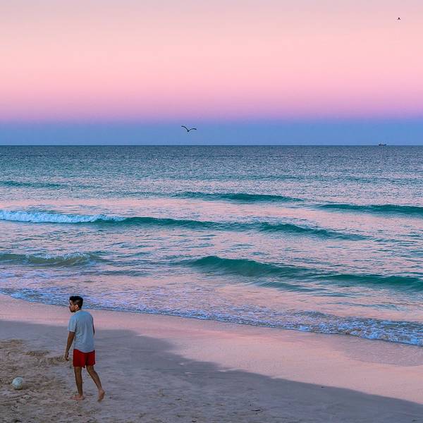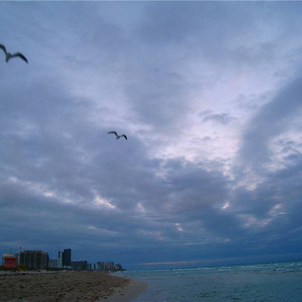 到达南海滩时,太阳正在一点一点躲进海平面,天色也渐渐黑了。海风很大,海水很冰。但天空从橙色变成梦幻的粉紫色,湛蓝的海水也被天空映成淡淡的紫色,让人就想呆呆的站在细软的沙滩上,静静的听着海浪声发呆。冬天的迈阿密白天大约有二十几度,但是只有中午能下水玩一玩,太阳一下山风就会变大,海水就会变得很冷。所以傍晚这个时间,海里已经没有人在游泳了。人们纷纷放慢脚步,在海滩上漫步。迈阿密的天空真是美得令人窒息,拍出照片来就算不做修饰都自然澄净。海边有很多海鸟,在空中翱翔,然后突然一个俯冲,像个炮弹一样,一头扎进海里,一会儿工夫,就钻出水面,嘴里叼着它的战利品。