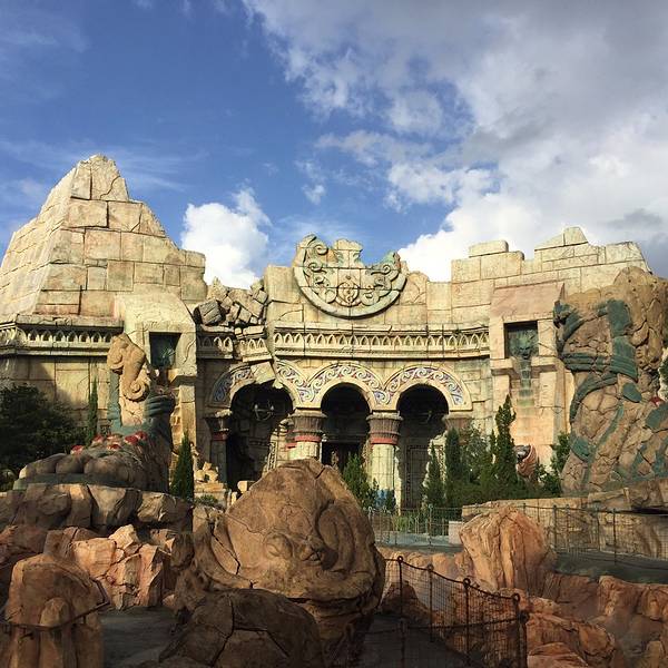 从侏罗纪漂流出来走几步就看到了这个,就是传统的激流勇进,很高,而且会湿身湿的很厉害。跟普通激流勇进不同的是,这个增加了动画的元素进去,坐着小船就像是在冒险一样,很有趣味性,在你放松警惕的时候又会来一个下坡。