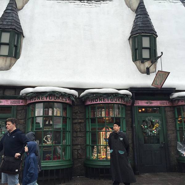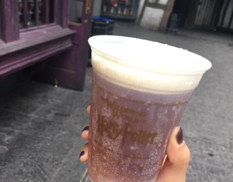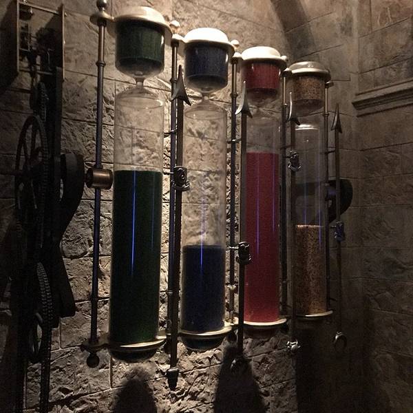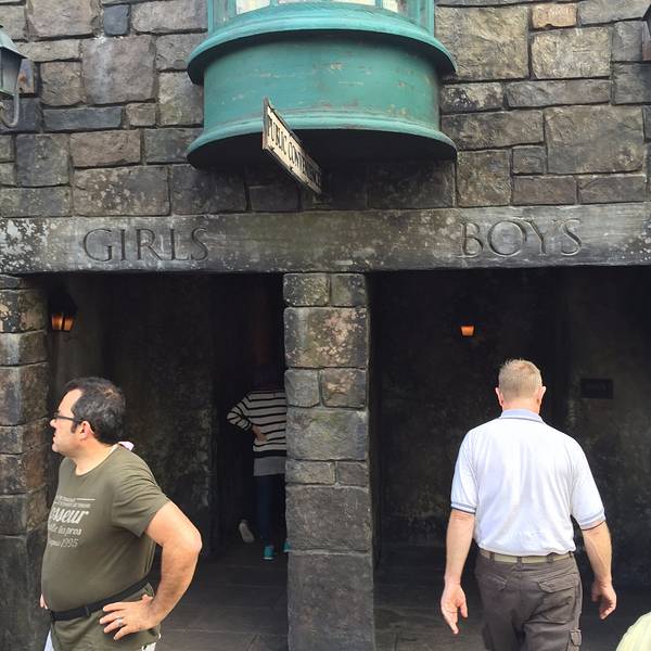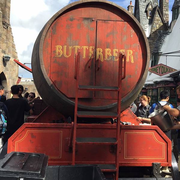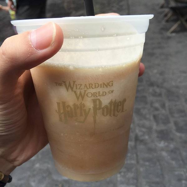 嗯。。。这里整个岛不大适合18岁以上的小伙伴儿们。。。会说话的喷泉过了一片波塞冬神话区,就到了最期待的哈利波特小镇了。其实冒险岛和环球影城各有哈利波特区的一半,冒险岛这里是霍格沃兹和霍格莫德村。这里的背景音乐最让人觉得身临其境。当然,这里的人不是一般的多,早上刚来的时候觉得这里无比的静谧,到了中午就人头攒动了,而且每家店里都挤满了人。九又四分之三站台就在这里面,可以坐这小火车前往环球影城,从那里出来就是伦敦的车站。可惜我们买的不是跨园区的票,只能在外面看看啦。早上的霍格莫德村。。。中午的。。。进门刚走了两步就看到卖butter beer的车,做攻略的时候就想尝尝看,所以果断的去排队。六刀一杯,可以选是不是frozen。个人觉得还是frozen的好喝,像冰沙一样,否则的话太甜了。味道很不错,而且不是啤酒只是普通的饮料哦~