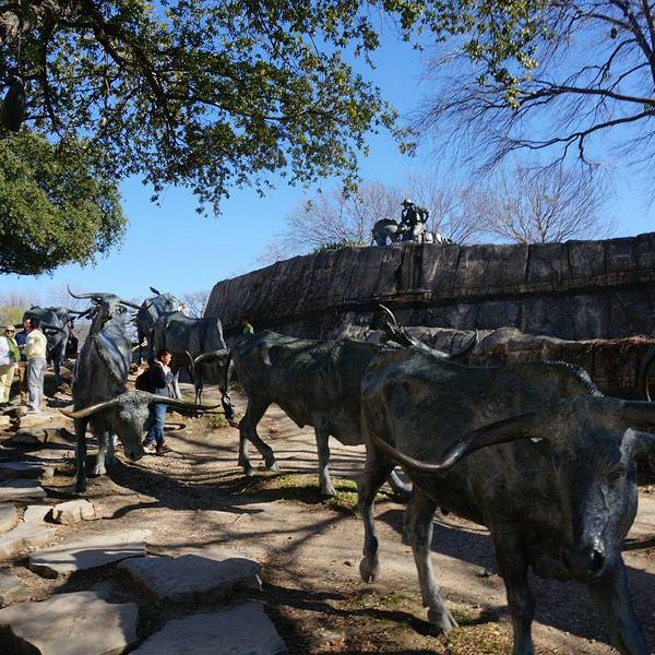 距离红色飞马很近,步行就能到达。被评为世界上最具创意的城市雕塑,这些雕塑展现着三个牛仔赶着40头长角牛上集市的情景,群牛雕塑充分体现了达拉斯的德州风情以及德州的过去与现在。附近有许多商店,出售各类牛仔服装及用具,比如靴子、帽子、衣服、配件、大头钉和马鞍装备,质量都绝对上乘。