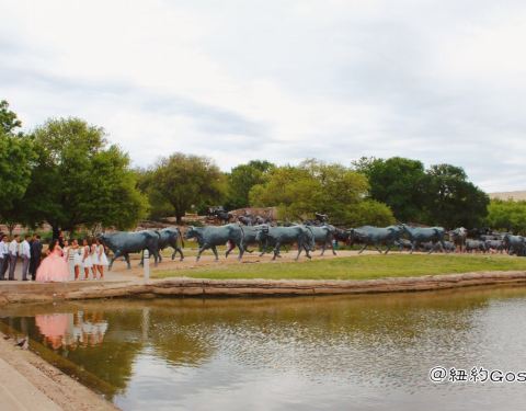 开拓者广场(Pioneer Plaza)这边有一大群的牛雕塑,材质应该是青铜,各种各样的形态都有,给人的感觉就像从山上冲下来了几十头牛,还挺壮观的。来这的时候池塘旁边恰巧遇到有人在拍婚纱照。很多人在这边散步。