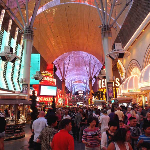 夜游拉斯的最后一站是费蒙街。费蒙街在奢华方面比长街要略输一筹,但也是霓虹闪耀、赌场林立,这里的声光秀不容错过。每到入夜,这个世界上最大的,由1250万个发光二极管灯泡构成的灯光顶蓬,便开始向游人展示超过一千六百万色彩的组合,变幻无穷的图形叫人眼花缭乱。费蒙街上还有许多化了状的人,等待游客花钱与他们合影。街中心的舞台上,歌手们在尽情的演唱,整个费蒙街沉浸在光色和喧闹之中。