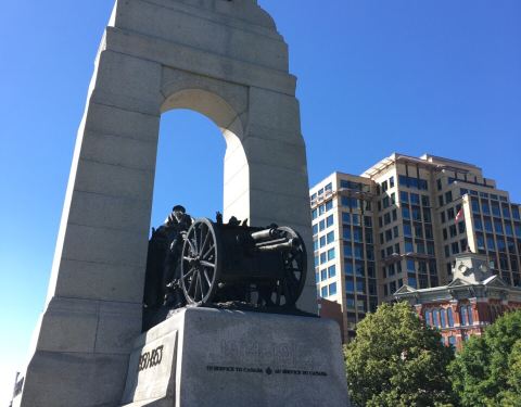 渥太华国家战争纪念碑位于市中心,距离国会山非常近从国会大厦到里多中心一定会经过这个纪念碑,从不同的角度看这个纪念碑,背后的背景都不一样,也因此各有特色