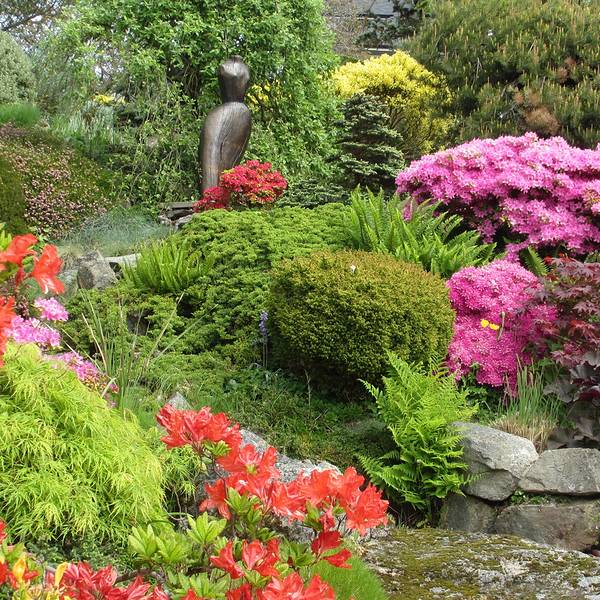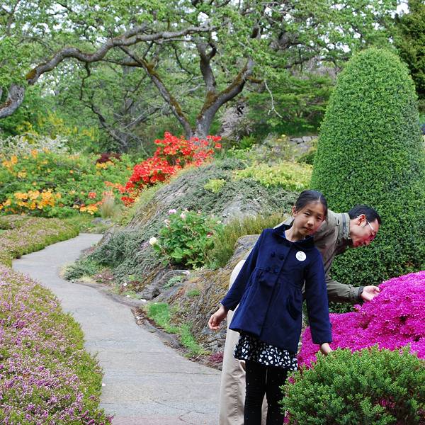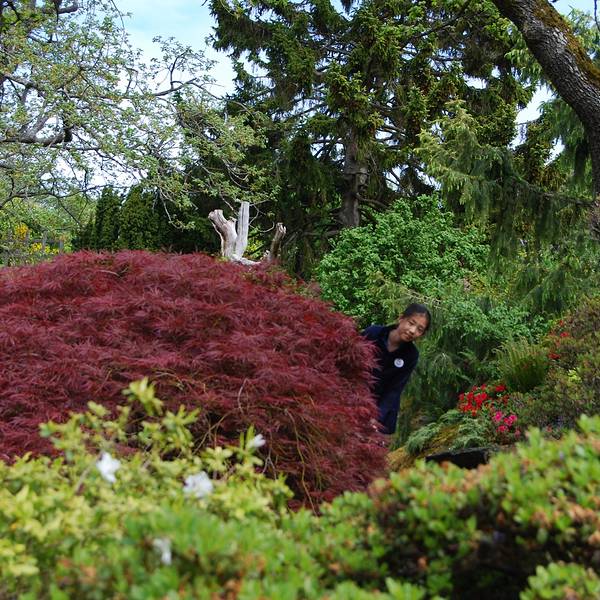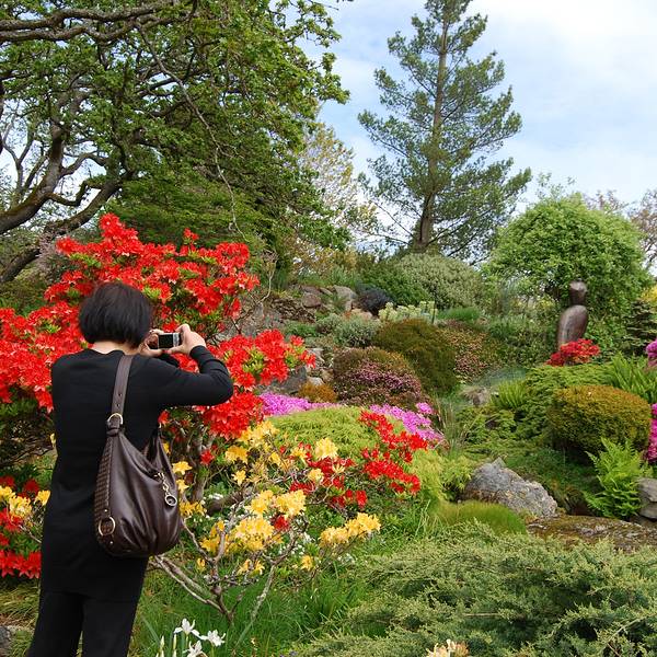 The Abkhazi花园 归途的路上,又找了私家花园,进去看看。 不需要门票,但是建议捐款,以维护园内的花草。 距离市区并不远的Abkhazi花园,是捷克的Nicolas Abkhazi王子与与英国破落贵族之女Peggy的家。两人年轻的时候相识于巴黎,后来战乱,Peggy与母亲甚至在上海都停留过几年。直至数年后,两人再次相遇,于1946年搬至此地,购买了一英亩大的土地,打造自己的家园。 两人没有孩子,将全部心血放在打点花园上,经过40多年的辛勤劳作,Abkahazi花园的花草如同他们的孩子,在他们逝去后,依然在庭院中盛开绽放着美丽。 2000年2月,The Land Conservancy公司从一家欲将这里推平改造成联排别墅的开发商手中,抢救了这个花园。直至现在,这家公司还有86万多加币的贷款。 可惜除了当地住户,很少有人知道这里。管理员估计也很少看到东方面孔,特意与我们聊天,询问如何知道的。