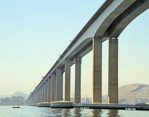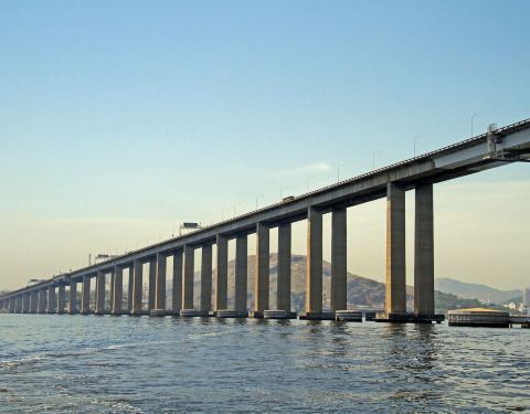 里约-尼泰罗伊大桥是一座箱形桥梁,坐落在瓜纳巴拉湾,将里约热内卢和尼泰伊罗(Niterói)连在了一起。这座跨海大桥是南半球较长的钢筋混凝土大桥,也是世界第六长大桥。壮观的里约-尼泰罗伊大桥,可以坐渡轮从远处欣赏,也可以坐公交经过,或者自驾车行驶在上面,近距离感受这份别样的美感。 1. 大桥往事 尼特罗伊在上世纪60年代前,曾经是里约热内卢州州府所在地。建桥之前,两市居民来往很不方便,需乘坐游船。里约-尼泰罗伊大桥始建于1968年,1973年修建完毕,1974年通车。这座长达14公里的连接里约城和尼特罗伊市的双向6车道的跨海大桥建成后,海湾变通途,每天来往大桥车辆多达11万辆。 2. 桥上风光 里约-尼泰罗伊大桥蜿蜒在碧波荡漾的的大海里,把两处美丽的风景连接在了一起。过桥时可浏览到里约市风光,迷人惬意。大海边,山脚下,各色建筑错落有致,鳞次栉比。现代化的高楼大厦和样式别致的小楼交相辉映,绿色的足球场和青翠的直升飞机停机坪点缀其中。