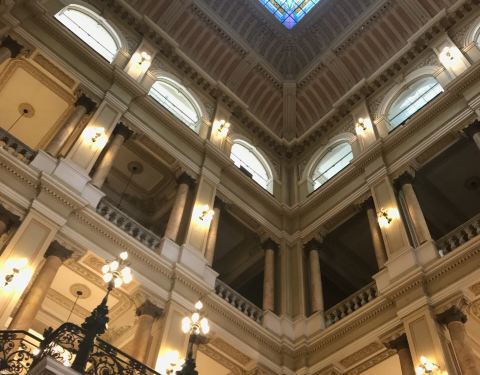 巴西国家图书馆居然能免费参观。里约市立剧院和巴西国家图书馆在一个小广场的两侧,都可以进去参观里约市立剧院和巴西国家图书馆在一个小广场的两侧,都可以进去参观。旁边还有里约市议会和音乐厅,小广场上可坐可走,非常闲适。巴西国家图书馆居然能免费参观。参观之前要存包,存包的时候工作人员会给每个人一...里约市立剧院和巴西国家图书馆在一个小广场的两侧,都可以进去参观。旁边还有里约市议会和音乐厅,小广场上可坐可走,非常闲适。巴西国家图书馆居然能免费参观。参观之前要存包,存包的时候工作人员会给每个人一个贴纸,贴在胸前。图书馆上下四层,始建于1910年,是拉美地区最大的图书馆,藏书900万册。不过在里面读书的人不多。 展开