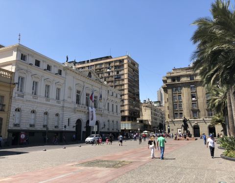 位于圣地亚哥的武器广场,几座复古建筑中间,但是其背后又是高耸的现代化大楼,给人冲突感很强