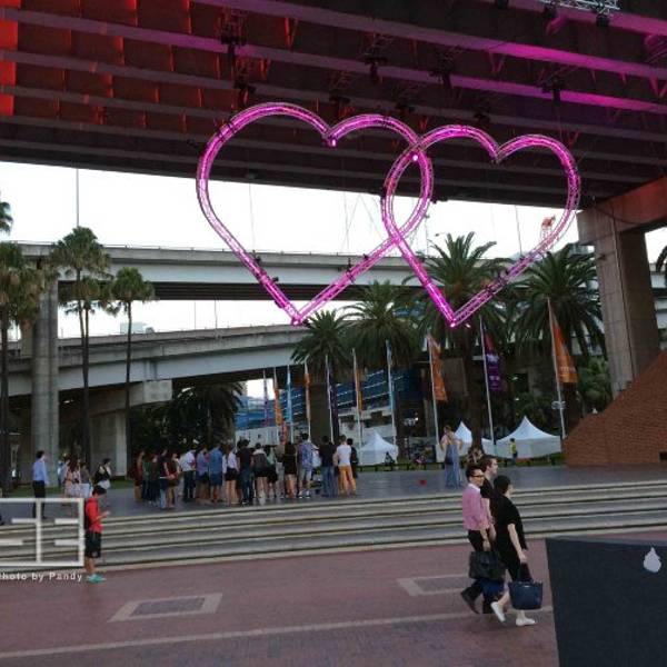 我们来到这里的时间,正好刚过完情人节,许多充满爱的装饰还没有被拆除,更是为达令港增添了浓浓的爱意,甚至连固定船的缆桩也是爱心形状。