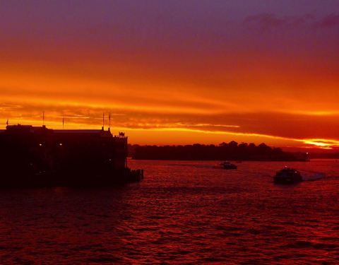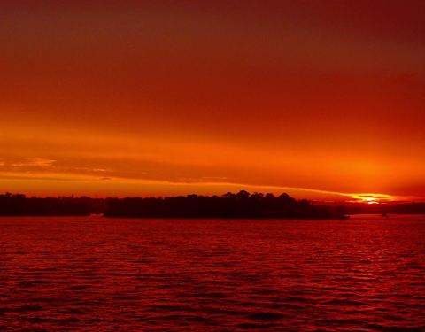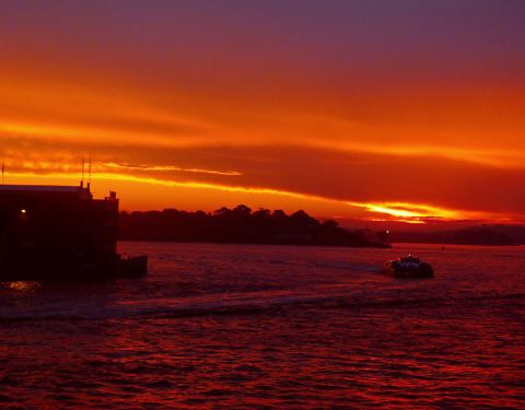 从澳大利亚悉尼港出发乘船航游,见到了最为壮观,美得令人叹为观止的夕阳!太阳象镶嵌着金边的红球,接近了地平线,天边燃起了熊熊的烈火,西边的天空被烧得一片通红,波光粼粼的大海被烧得一片通红,大海中航行的船舶被烧得一片通红!一切都被烧得通红!