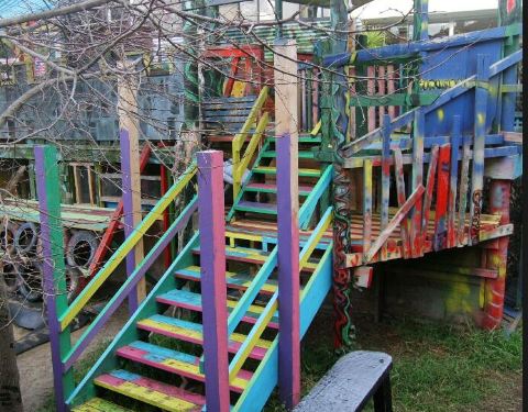 这里有很多项目可供玩耍,简直就是疯狂的大杂烩,从月牙滑雪道到高空滑索再到很多的攀援结构。餐厅里可以泡自带的茶和咖啡,也可以自己掌厨,也可以贡献一个“扮小丑”向经营这个园区的志愿者表示感谢。