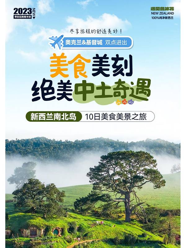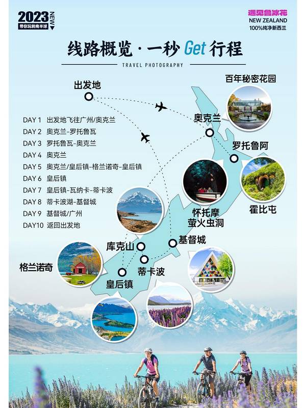 🌟 💼关于签证: 有效期内6个月护照、2寸白底照片、身份证、户口本、房产证、工资流水、理财证明等✈️ 💐关于季节: 春季:万物复苏,春暖花开,适合旅行! 夏季:天气晴朗、旅游旺季,总体价格偏高,但与国内春节和寒假叠加,别错过哦! 秋季:色彩丰富,仿佛进入了一幅油画! 冬季:南方小伙伴的福利!在这里可以滑雪,而且除了雪山顶皇后镇并不冷哦!❄️ ⚠️注意事项: 租车:驾照无需公证,只要有翻译件就好!但记得注意安全,特别是南岛山路!🚗 酒店:提前规划行程,预订酒店。多个平台对比,早预定价格实惠!🏨 饮食:新西兰是移民国家,饮食多样化,不必担心吃不惯!尽情享受美食吧!🍽️ 🌟南岛中线精华景点,让你仿佛置身仙境! ✨ 基督城,梯卡坡,库克山,箭镇,瓦纳卡,皇后镇,格林诺奇小镇,米尔福德峡湾,还有瓦纳卡湖、梯卡坡湖、普卡基湖、瓦卡蒂普湖等等,都是南岛的精华! 🌟新西兰北岛也是国内前往必经之路! 🌟 奥克兰,怀托摩萤火虫洞,罗托鲁瓦地热资源,霍比特人电影之旅,让你大开眼界!🌋 不用担心花费问题!💰 十天含机票所有费用,避开高峰春节的话,2个人4万左右就能玩得尽兴!🎉 那么如何安排十天行程?看看这个让你轻松玩转新西兰南北岛!✈️ 🌟【线路概览】一秒Get精华🌟 💫D1 全国各地-广州-奥克兰 从全国各地出发,前往广州,搭乘航班直飞奥克兰! 💫D2 奥克兰-罗托鲁阿 怀托摩萤火虫洞 来到罗托鲁阿,探索繁星点点的怀托摩萤火虫洞,还可以品尝白云峰牛排餐! 💫D3 罗托鲁阿-奥克兰 玛塔玛塔小镇 在玛塔玛塔小镇,亲身感受指环王的魔幻世界,还可以去爱歌顿农场体验农村文化! 💫D4 奥克兰 畅游奥克兰,享受这个城市的独特魅力! 💫D5 奥克兰-皇后镇-格林诺奇-皇后镇 直飞皇后镇,从天堂之路前往格林诺奇小镇,再回到皇后镇! 💫D6 皇后镇 在皇后镇自由活动一天,尽情探索各类冒险活动! 💫D7 皇后镇-瓦纳卡-梯卡坡 游览箭镇、皇后镇、瓦纳卡镇、梯卡坡,感受南岛湖区的壮丽景色! 💫D8 梯卡坡-库克山入内-基督城 入内库克山,探索新西兰南岛的天际线! 💫D9 基督城-广州 从基督城返回广州,结束这段精彩的旅程! 💫D10 广州-全国各地