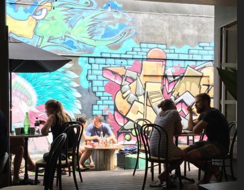 这是当地的一家咖啡厅,里面很有艺术气息。里面不仅有咖啡,还提供一些简餐。最有特色的是这家咖啡厅的墙壁上有很多现代风格的涂鸦,里面咖啡和食物的味道都很棒,气氛也很棒,是一家很惬意的地方。