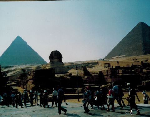 先在最大的胡夫金字塔前转转,这是第四王朝第二个国王胡夫的陵墓,建于公元前2690年左右。这座金字塔除了以其规模的巨大而令人惊叹以外,还以其高超的建筑技巧而得名。塔身的石块之间,没有任何水泥之类的粘着物,而是一块石头叠在另一块石头上面的。每块石头都磨得很平,至今已历时数千年,就算这样,人们也很难用一把锋利的刀刃插入石块之间的缝隙,所以能历数千年而不倒,这不能不说是建筑史上的奇迹。很想到近前仔细看看石块,但有个矮铁链挡着一直没敢进去,直到看见队友,问明情况才近前细看。巨大的石块足有二三米见方,在阳光下泛着淡淡的金光,虽然下面几层已不太整齐,每块石头也有破损。但都散发着远古迷人的魅力,让你引不住要接近她,扶摸她。然后来到后面的第二座哈佛拉金字塔,胡夫的儿子哈佛拉国王的陵墓,建于公元前2650年,比前者低3米,现高为133.5米。由于它的地面稍高,因此看起来似乎比胡夫的金字塔还要高一些。 它破损的程度差一些,以至于塔尖上还可见到一层外表层,没有完全脱落,象个帽子一样戴在塔尖上。第三座门卡乌拉金字塔,属胡夫的孙子门卡乌拉国王,建于公元前2600年左右。当时正是第四王朝衰落时期,金字塔的建筑也开始被腐蚀。门卡乌拉金字塔的高度突然降低到66米,内部结构倒塌。然后上车来到一片高地,这里可以看到3个金字塔全景的地方,自由行的游客可以骑当地人的骆驼走到远一点,换一个角度拍照,可以将3个小的3个大的,共6座金字塔全部拍到。欣赏到这时,整个吉萨金字塔群并没有给我多少震撼。它们坐落在城市边上,旁边就是破烂的房屋,加之跟前混乱的人群和小贩,都不是我心中孤傲的金字塔形象。著名的景点一定要有周边的环境配合,相得益彰才能凸显他们的魅力。