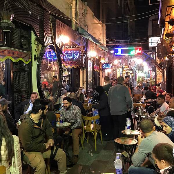 咖啡馆的“珍藏”:吱呀作响的吊扇、蒙尘的镜子、泛黄的名人照片,其中包括埃及末代国王法鲁克。在这里,喝咖啡之外还能体验阿拉伯水烟等,别具异域风情。水烟(Sheesha)是埃及咖啡馆中的灵魂。许多人泡咖啡馆就是为了吸一口水烟。店家准备了烟草、炭火,送到客人跟前。只见抽烟的滤嘴开在一侧,只要一吸,烟气透过底部玻璃瓶内的清水汩汩作响,一股甜味弥漫开来。埃及的烟草多属甜腻口味,Maasil是最受欢迎的口味,但过于浓烈,也不太腻人。
