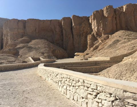 其规模虽不及国王墓,但内部壁画与国王墓完全不同,自由奔放,反映了当时埃及人的生活习俗。王后谷门口全景”王后谷则位于岩石山的南边,是埋葬同一时间的女法老、王后、王妃和公主等的,数量有70多座。其规模虽不及国王墓,但内部壁画与国王墓完全不同,自由奔放,反映了当时埃及人的生活习俗。“