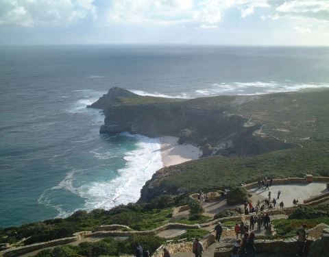 好望角一开始被称为好望角,是位于非洲西南端非常有名的岬角,它是开普敦的标志性建筑,也是南大西洋与印度洋的交汇处。好望角处于好望角自然保护区内,保护区内其实有两个海角,除了好望角还有一处海角名为开普角,它同样是景区内比较受欢迎的景点。 好望角虽在保护区内,但却可以开车进入。景区大门非常简单,进入后两旁都是鲜花灌木,绵绵远山。在通往好望角的路上可以远远看到远处山坡上有一座黑白分明的纪念碑,这座纪念碑是为了纪念从欧洲绕好望角到印度航海路线的开拓者——葡萄牙航海家达伽马的,由于纪念碑在上坡上,山上杂草丛生,基本无法达到纪念碑脚下,只能远眺。 在纪念碑隔着马路的另一侧,还有一座面向大西洋的纪念碑,这是另一位葡萄牙航海家迪亚士的纪念碑,一开始也就是他命名这个海角为好望角的。一路上还可以看到不少狒狒蹲着路边休息,它们一点也不怕人,悠然自得的散步或休息。 这里有两条路,一条是通往好望角,一条是通往开普角的,开普角在山上,需坐缆车前往,好望角则在海边。如果先前往开普角的话,行驶到山脚下的入口,随后可以坐缆车或者步行上山。步行的话约半小时便可到达顶端的灯塔,如果想节省体力选择坐缆车的话,可在山脚处购买缆车票。缆车每次可容纳40名游客,上山单程3分钟。运营时间:周一-周日9:00-17:30。 此外,山脚下还有专卖纪念品的商店,有兴趣的话可以在此购买明信片,然后盖上好望角的纪念邮戳寄给自己或朋友。 抵达山顶可以远眺整个好望角的全景,天气晴朗时蓝天和海水的颜色相互映衬,让人流连。开普角上有一座老灯塔,这座老灯塔也是好望角的标志性建筑。登上几十级台阶便可来到老灯塔处,这座老灯塔如今已经不使用了。在老灯塔下有一块大石头,上面是来自世界各地游客的涂鸦。在老灯塔的前方还有一个木杆,木杆上有几块指向不同方向的标志牌,上面写着这里距离世界各地各大城市的距离,你可以找到它距离首都距离12933公里。 站在山顶除了一览迷人的海景外,还可以眺望不远处的好望角。好望角是大西洋寒流和印度洋暖流的分界,你可以看到海上有一处明显的浅蓝与深蓝色的分界线,在你的左手边是印度洋,右手边是大西洋。看过两大洋的分界线后,绕过灯塔还可以继续往前走,此时你不妨回头再看一眼开普角山顶的景象,会发现它异常的雄伟壮观。 继续向前走到尽头,这里便是海角点的南端。可以看到面前不远处有一座开普角目前正在使用的新灯塔,而刚刚看到的那处山顶灯塔由于位置相对太高,遇上海上起雾的话,海面上的船只会经常看不到,因此在距离海面较近处重新建立了这座新灯塔。新灯塔位于乱石峭壁下,游客无法到达,不过可以通过尽头处旁的一块石碑了解灯塔的历史。 从开普角的上下来后,便可前往好望角。好望角是一个突出的小山岬,这里气象万千,景象奇妙。天气晴朗的时候,可以看到湛蓝的天空,深蓝的海水,棕色礁石和白色浪花,以及清爽的海风和一群群自在飞翔的海鸟。 你可以在好望角边上的海滩上走一走,这里的海滩和你印象中的不一样,这里到处是乱石,而且风浪非常大,天气不冷的话,你可以慢慢走到靠近海水的礁石边,触摸一下大西洋的海水,但一定要小心脚下,以免滑倒。海滩上还散落着很多被海水冲上来成堆成堆的海带,这里不容许贩卖海带,不过你可以拿起一根拍个照留念一下。 走到海滩另一头,这里有一块长条金色标志纪念牌,半人高的纪念牌由三块拼接而成,左边是英文,右边是阿菲力康文,也就是南非荷兰语,而中间则是好望角准确的经纬度18°28'26"E,34°21'25"S。这里也是每一个来好望角游客合影留念的地方,你不妨也在此拍张照,证明自己到过这里。 参观完如果还舍不得离开的话,不妨前往景区内的餐厅去坐坐,这家名为Two Oceans Restaurant的餐厅位于山顶,距缆车下客站不远处。餐厅拥有很棒的视野,可一览福尔斯湾迷人海景。