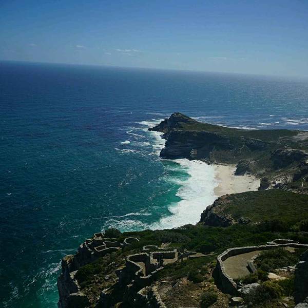 好望角自然保护区位于开普半岛南端,始建于1939年,占地7750公顷,海岸线绵延40多公里,有100多处海滩,被誉为世界上最美丽的景点之一。由西向东分成三个部分,即好望角(Cape of Good Hope)、麦克莱尔角(Cape Maclear)和开普角(Cape Point)。其中开普角海拨238米,像一把利剑插入海中,崖顶有始建于1857年的灯塔,登临远眺,海天一色,浩淼无际,景色壮观。