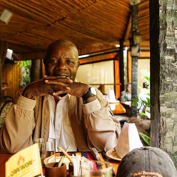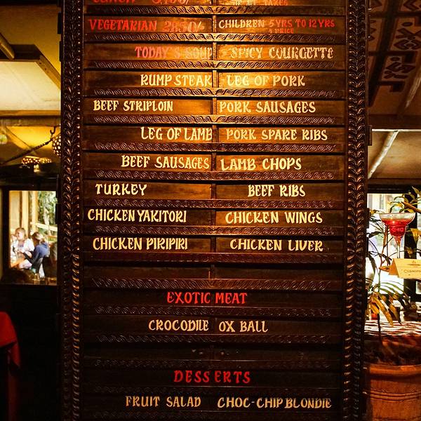 Carnivore,一进门呲呲冒烟的烤肉炉~咦,难道焦点不是前方兄台的大白牙么~当天中午的特色肉是鳄鱼丸子这是我们全程的司机兼向导:Allan,从业时间10年以上,在steenbok服务5年。酱料有6种,配合不同的肉,吃的时候根本记不住,爱谁谁。小旗子竖起来表示战斗力在,服务员会不停地上肉,什么时候吃不下了,就把小旗子放倒。