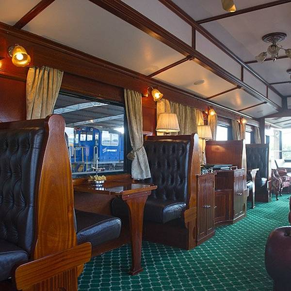 这辆古董列车由英裔南非富商罗罕·沃斯于1989年创办,奢华的木制车厢内,即有客房、餐厅、酒吧、图书馆,也有专门的观景车厢等等,一路穿越非洲大陆,乘客可以尽情欣赏窗外的非洲美景。非洲之傲的旅程从为期48小时的线路到为期14天的线路精彩纷呈,选择多样。这是列车尾部的全景展望车箱,车厢后端是甲板式眺望台,经常会有羚羊,鸵鸟一类的野生动物出没在铁路两侧的原野上。这趟列车的每个房间都别致的以非洲地名命名,整列火车只有36间超级订制的套房,最多只能接受搭载42-72位贵宾,因此通常需要提前半年以上才能预订的到。豪华宽敞的皇家套房,房间内超过5扇大窗可以随时开启,能尽情欣赏窗外的非洲美景,而且,每个包厢都有独立的冷暖空调和卫浴设施。