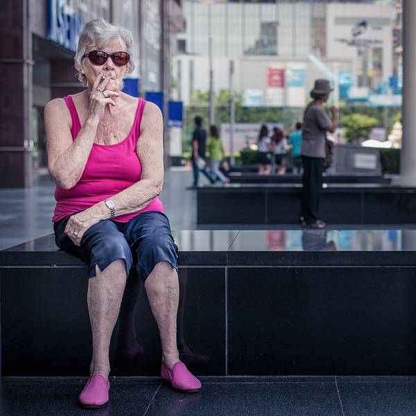 一位满头银发的老太太坐在商场外吸烟,虽然她已满脸皱纹皮肤松弛,但是她的气质和打扮却十分抢眼!