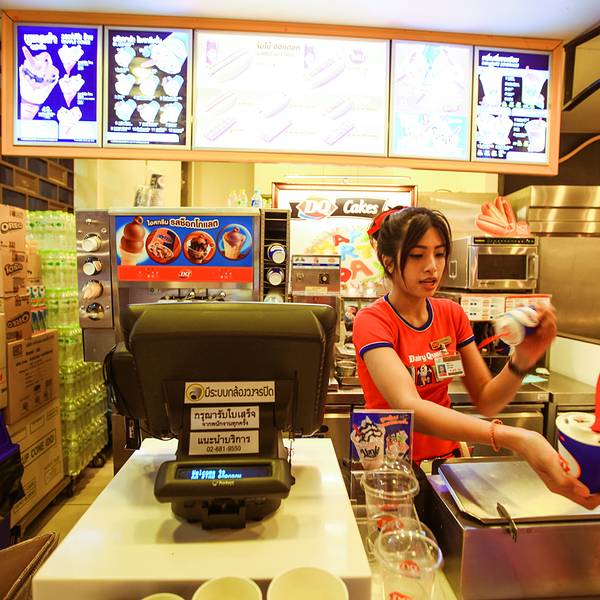 如何到达:central world位于SkyTrain的”Chit Lom”站。这里有美食,影院,店铺还是以经营中高档物品为主。著名的四面佛也在这站,传说极灵,但需要回来还愿。旁边还有Big C大超市,不过感觉没啥可逛的。central的底楼,是一个海洋世界,正好今天也是星期六,好多小朋友Siam Paragon,Siam center,Siam Discovery都位于siam站附近,从central world步行过来10分钟左右。这三个地方有空中走廊联通,很方便从一个走到另一个。主要以名牌为主,价格不菲,沿街也有很多街铺。游客和年轻人为主要购买者。Siam Discovery有IMAX影院,价格比国内的便宜,但是考虑到字幕看不懂,我们没去看。整个地方很大,全逛完需要大半天,晚上这里打车要排队。在central world 的ISETAN下面有两尊佛像,据说是求姻缘的,每天从早到晚都有很多年前男女手握一只玫瑰花,在这里祈祷!来泰国,必须要吃他们的DQ,便宜到哭有没有!