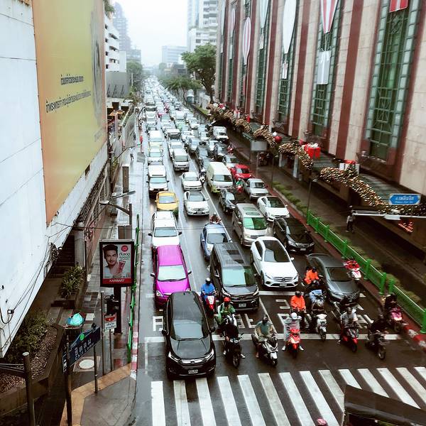 - 说实话曼谷的商场还是很不错的,算豪华吧,比国内的购物商场好多了,档次要好。雨中曼谷街头等待红灯的车流