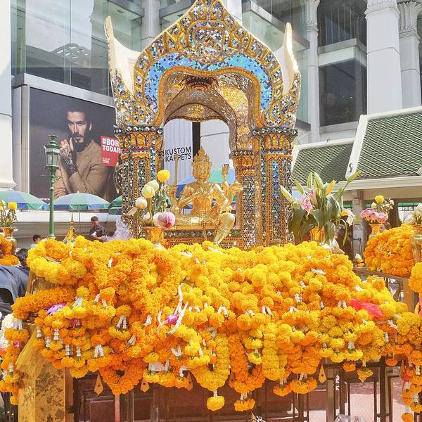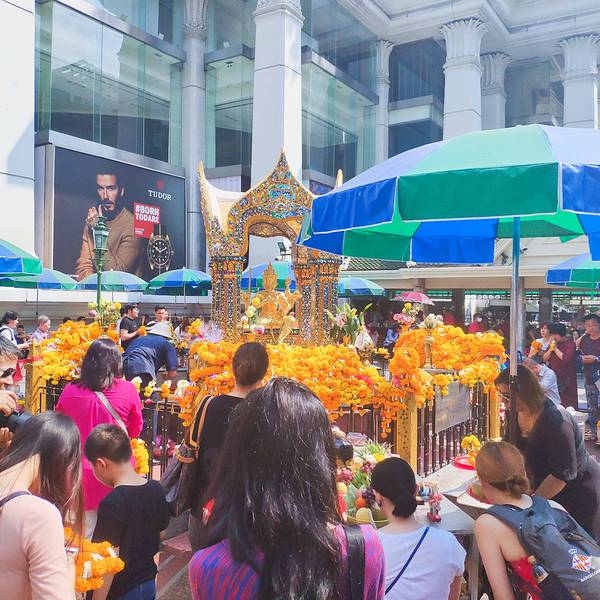 由于我们并不热衷于购物,所以逛了会,就直接去看附近的四面佛。它是泰国香火鼎盛的祈福场所,深受谢霆锋、萧亚轩等港台明星的追捧。四面佛神像摆放在花岗岩神龛内,全身金碧辉煌,四面都是同一面孔、同一姿态。参拜四面佛是有讲究,四个面各象征事业,婚姻,发财,平安。从进门面对你的那一面佛像开始,顺时针参拜,每面上香,用一根蜡烛和一串花圈,最后在左上角处用那的小杯子舀一碗水,拍在额头,手臂和手上,就结束了。 展开
