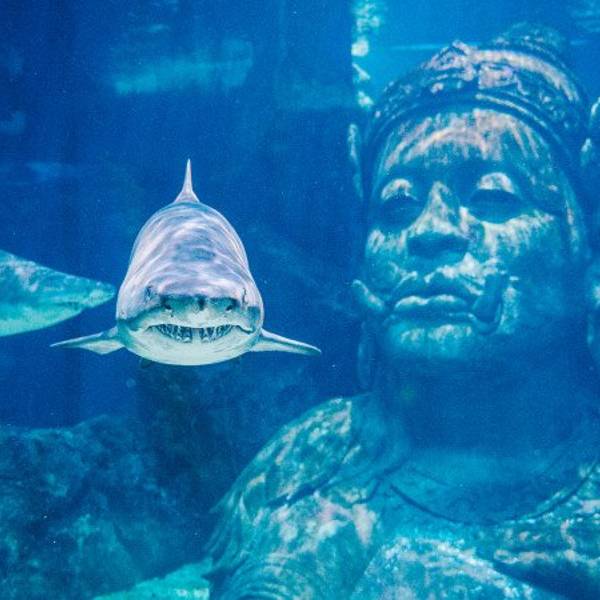 这个水族馆最大的特色就是佛像与鲨鱼的完美结合,那佛像的手,仿佛能触到鲨鱼的背脊