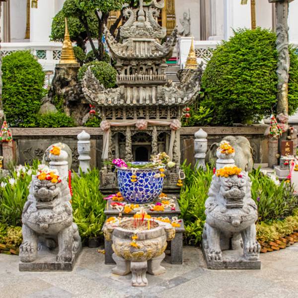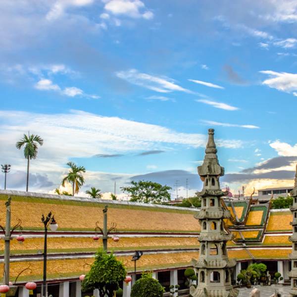 由曼谷市中心的大皇宫步行十余分钟便可以到达苏泰寺,寺庙的外观显得格外低调,然而却在泰国当地人心中享有盛誉。这座庙宇之中,安放着泰国第八位皇帝的骨灰。走进寺庙之中,庭院内显得颇具中国特色,中国式宝塔,以及飞马造型的铜像安置其间。
