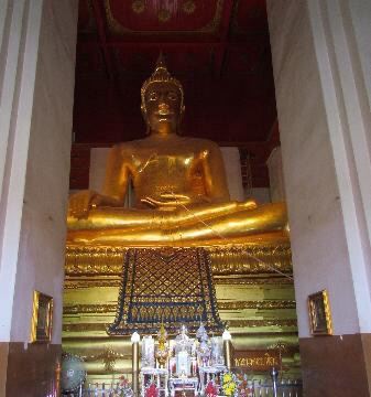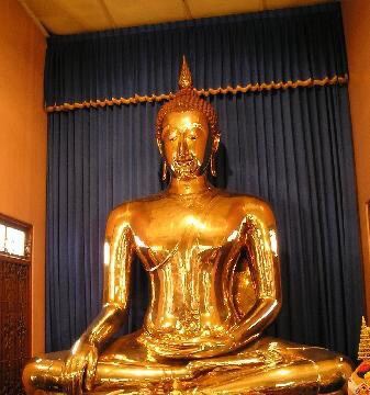 金佛寺,是泰国华人对该寺的称呼。佛寺所在地是华人聚居区,三位华人集资建成这座寺院,故又称三华寺或三友寺。寺内因供奉着一座世界上较大的金佛而闻名,具有非常重要的历史及艺术价值,是泰国的标志性艺术。 进寺需知 位于西南面的附近,不管是白天还是傍晚这里每天香火都很旺盛,同时也吸引着来自世界各地的游客。需要注意的是进入须衣着端庄,穿着长裙和长裤。进入金佛殿须脱鞋,赤脚才能进入。寺庙内有很多地方都需要赤脚进入,游览时请注意留心指示牌。 金光璀璨的金佛殿 走进这道寺门,就可以望见高高在上的金佛殿了,从廊柱到上方的塔顶,无处不闪烁着金色的光芒。上到金佛殿的台基上,透过敞开的殿门,能够望到那座金光闪烁的金佛盘腿端坐在洁白的基座上,仿佛在注视着每一位跨进门槛的香客。 金佛由来 根据资料介绍,这座佛用纯金铸成,重5.5吨,高近3米,盘坐的双膝相距3米有余。据说佛寺所在地本十分荒凉,后来华人逐渐聚居。他们把扔在荒山上无寺肯要的佛像雇车搬了回来。几经周折运抵佛寺后,佛身有一块铁壳掉下,露出里面金光闪闪的金身。把所有铁壳敲掉后,金光闪亮的完整佛身露了出来,因此名闻全国,后定名该寺为金佛寺。 盘坐冥想 金佛殿内的空间并不是很大,一些香客静静地跪坐在地上祈祷。虽然寺庙内没有禁止拍照,但是出于对佛像的尊重,建议不要拍照。你可以找个位置盘腿坐下来,静心的冥想一番。