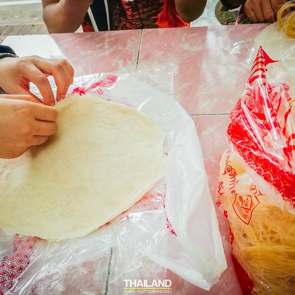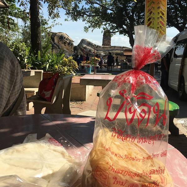 下车后导游先让我们集合,然后给我们团员发了一种神奇的食物。对,图上的就是大成特色——龙丝糖饼。丝糖的口感,有点像我们国内的龙须酥,不过当地人是配...一个半小时后,前往大城的卧佛寺,也就是罗卡雅苏塔寺。