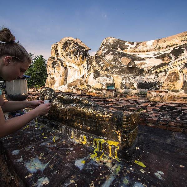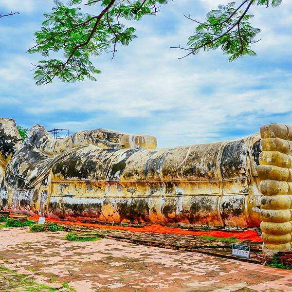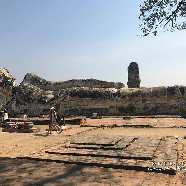 周边还有骑大象,有兴趣的朋友可以试试!帮佛爷捏捏脚,让我也顺便沾点运气Wat Lokayasutharam 大城卧佛寺,当地人叫做帕侬寺(Wat PaNo),因为巨大的卧佛而闻名!这尊长达42米的佛像,当年也没能逃过被毁的命运,现在看到的是依据大城中期的艺术风格在1956年复原的。